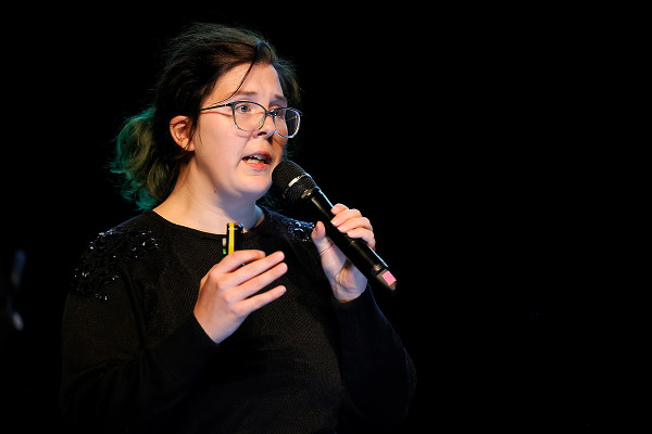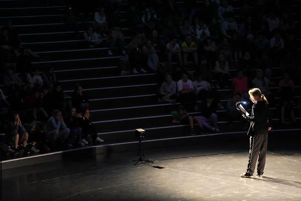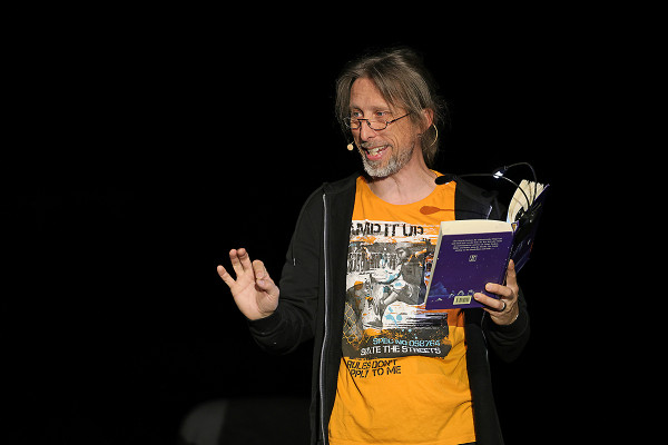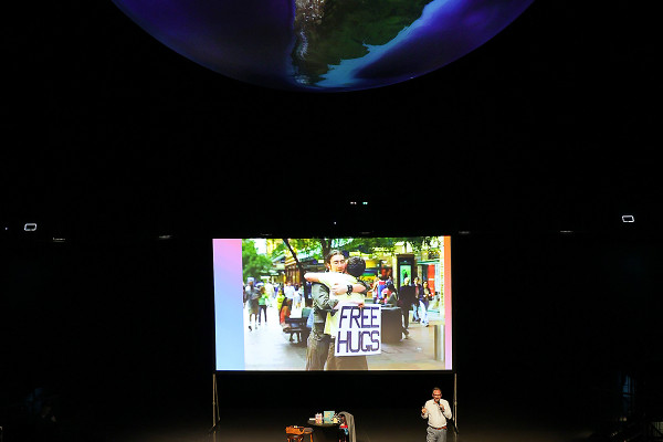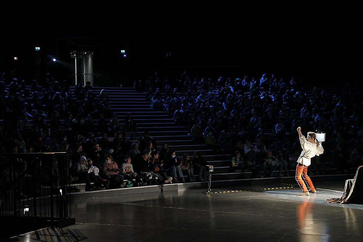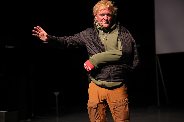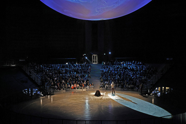 Im Innenraum - direkt unter der schwebenden Erdkugel - trug der bekannte Schauspieler Rainer Rudloff skurrile Geschichten aus “QualityLand“ von Marc-Uwe Klings oder dem Reisebuch “Die Letzten ihrer Art“ von Douglas Adams vor. Früher ist der Kultautor "Per Anhalter durch die Galaxis" gefahren, im Gasometer lauschten die Besucher*innen nun Ausschnitten seiner Reise rund um den Globus. Spielerisch, humorvoll und fesselnd erzählte Rudloff dabei auch vom entspannten Plausch mit einem Berggorilla.