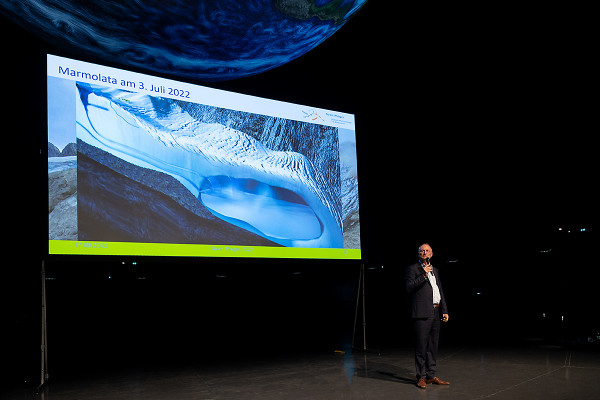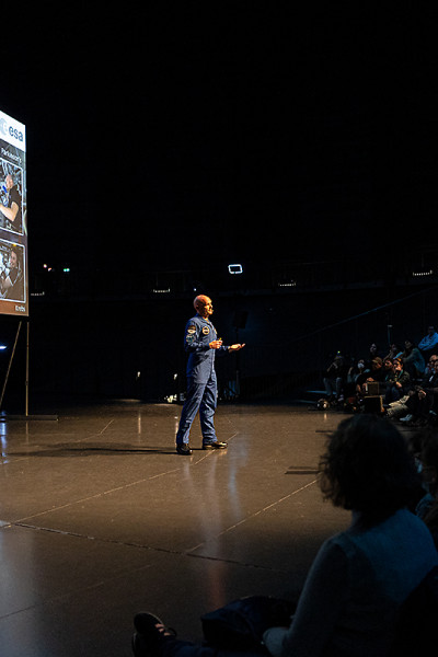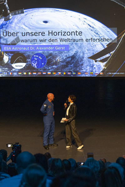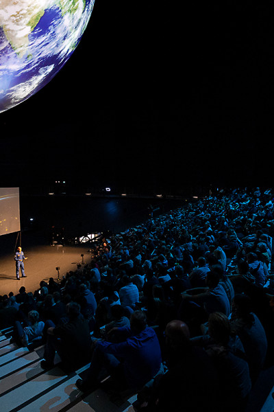 An die Präsentationen der Schülerinnen und Schüler schlossen sich weitere Highlights an. Zunächst berichtete der deutsche ESA-Astronaut Dr. Gerhard Thiele von seinen Erlebnissen im Weltall. Er umkreiste im Jahr 2000 an Bord eines Space Shuttle viele Male die Erde. Seine Mission diente dazu, die Landmassen mithilfe von Radarsensoren topografisch zu vermessen und so ein 3D-Höhenprofil der Erdoberfläche zu erstellen. Das leitete nahtlos zu den Ausführungen von Nils Sparwasser über: Der DLR-Experte für die satellitengestützte Fernerkundung erläuterte, wie wichtig die Daten aus der Umlaufbahn sind, um den „Gesundheitszustand“ unseres Planeten zu untersuchen – unverzichtbare Informationen für die Klima- und Umweltforschung. Er war auch wesentlich an der Erstellung der animierten Erdkugel beteiligt, die beim jugendlichen Publikum am Ende der Veranstaltungen für Staunen sorgte: Auf dem übergroßen Globus bewegten sich Wolken, wechselten Tag und Nacht ab, zogen Schiffe und Flugzeuge ihre Spuren rund um die Welt. Diese knapp 20-minütige Vorführung ist Teil der Ausstellung „Das zerbrechliche Paradies“, die auch von den anwesenden Schulklassen besichtigt werden konnte. Sie ist noch bis zum 26. November 2023 von Dienstag bis Sonntag und in den Schulferien sogar täglich von 10:00 bis 18:00 Uhr
