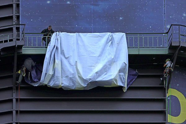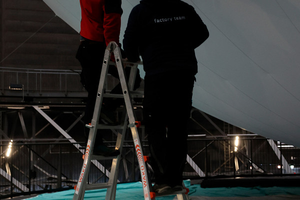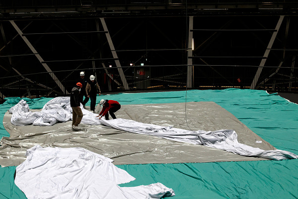 Damit die hochauflösende Projektion auf der Erdskulptur im Luftraum des Gasometers nicht durch Reflexe oder Streulicht aus dem Ausstellungsbereich gestört wird, befestigten Höhenkletterer in den letzten Aprilwochen eine ganze Reihe von Stoffbahnen. Diese trennen die Manege und den darüberliegenden Luftraum vom Rest der ersten Ausstellungsebene. Auch die Dachgauben werden noch mit einer Folie abgedunkelt. Ausstellungsaufbau im Mai 2021.