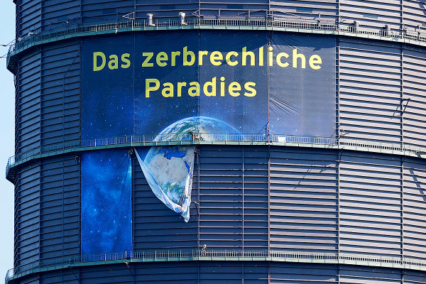 Megaposter zur neuen Ausstellung „Das zerbrechliche Paradies“ an der Fassade des Oberhausener Gasometer angebracht