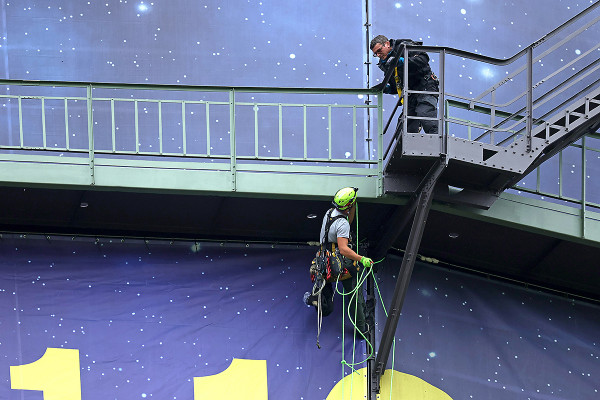 Da diese Riesenplakate natürlich nicht einfach an die Fassade geklebt werden können, kommen hier versierte Profis zum Einsatz. In luftiger Höhe seilen sich Industriekletterer Peter Peilert und sein Team vom Gasometer ab, bringen die insgesamt 24 Einzelteile in Position und verbinden sie zu zwei überdimensionalen Megapostern. Die bis zu sieben Kletterer vom „Höhenhandwerk“ wissen was sie tun, denn bereits bei den Gasometer Ausstellungen „Der Berg ruft“, „Christo: Big Air Package“, „Der schöne Schein“ und „Wunder der Natur“ kam ihre Expertise zum Einsatz. Bleibt uns nur noch die traditionelle Grußformel von Bergsteigern – und auch Fassadenkletterern – zu rufen: „Berg Heil!“