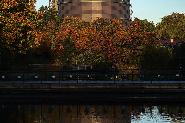 Der Treppenturm und das Dach des Oberhausener Wahrzeichens werden zunächst in dunklem Blau angeleuchtet, während auf der Centro-Seite eine Projektion zu sehen ist. Nach dem 23. Dezember wird das Motiv farblich variiert. Aber nicht nur auf der Außenhülle des Gasometers wird deutlich, dass „Die neue Emscher kommt“. Auch im Inneren des Industriedenkmals ist die Renaturierung der Emscher ein Thema. Im Rahmen der aktuellen Ausstellung „Das zerbrechliche Paradies“ wird der Wandel des Flusses von der „Köttelbecke“ zum artenreichen Biotop beschrieben.