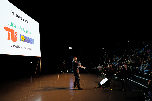 In dem riesigen Innenraum des Gasometers hängt eine gewaltige Erdkugel wie ein überdimensionaler Globus: 20 Meter im Durchmesser, in der Dunkelheit leuchtend und von beeindruckender Schönheit! Darunter standen Schülerinnen und Schüler, um ihre Arbeiten zu präsentieren. Mehrere hundert Jugendliche aus nordrhein-westfälischen Schulen verfolgten aufmerksam die Ausführungen der Schul-Teams. Beim ersten der drei Projekte geht es um die Sonne. Mit speziellen Teleskopen, die in Berlin stationiert sind, haben die Schülerinnen und Schüler der Merian-Schule aus Köpenick die Sonnenoberfläche beobachtet. Dabei untersuchten sie insbesondere Sonnenflecken hinsichtlich der Anzahl und Größe. Da diese dunklen Punkte über mehrere Tage hinweg allmählich ihre Position ändern, konnten die Jugendlichen daraus auch die Geschwindigkeit ableiten, mit der die Sonne um ihre Achse rotiert. Noch waren sie dafür vor Ort auf dem Dach des Freizeit- und Erholungszentrums (FEZ) in Berlin-Wuhlheide, das als Partnereinrichtung des DLR die Sonnenteleskope betreibt. Künftig werden auch Schulen aus der Ferne Zugriff auf die Anlage haben: Dann soll die Steuerung der Teleskope und die Beobachtung der Sonne auch online möglich sein – ganz gleich, an welchem Ort sich das Klassenzimmer befindet. Betreut wird das Projekt vom DLR_School_Lab Berlin, einem von 16 Schülerlaboren, die es an DLR-Standorten und kooperierenden Hochschulen gibt.