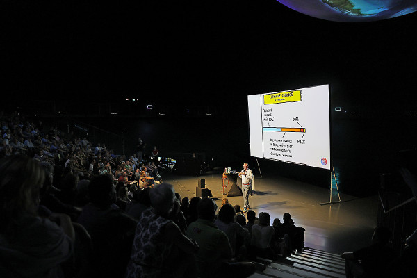 Kurzweilig und wissenschaftlich fundiert, ging der Journalist und Autor auf die zahlreichen Herausforderungen ein, die wir Emils Generation hinterlassen: Klimawandel, Artensterben und globale Instabilität. Oder wie Jeanette Schmitz, Geschäftsführerin der Gasometer Oberhausen GmbH, es am Ende des schönen Abends zusammenfasste: „Ein humorvoller und gleichzeitig sehr informativer Vortrag, der uns alle nachdenklich stimmt.“