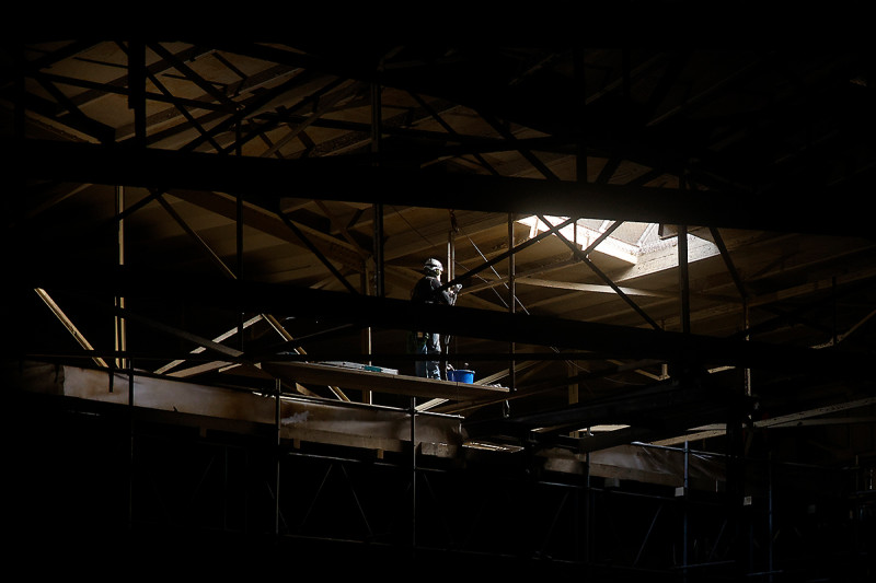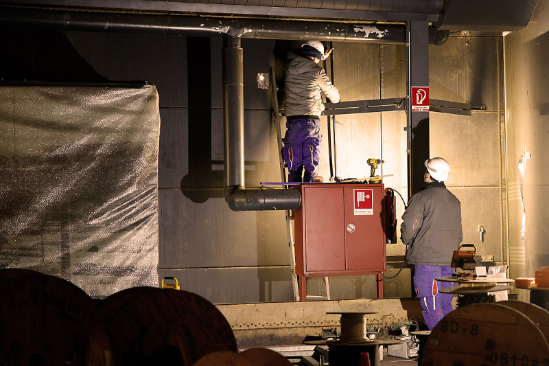 Lediglich die Arbeiter, die derzeit die Korrosionsschutzarbeiten an der Innendecke durchführen, sind mit ein paar wenigen Bauleuchten ausgestattet. In den letzten Tagen wurden die Schutzabdeckungen der Dachgauben Stück für Stück entfernt, und es fällt wieder ein wenig Tageslicht in den Gasometer. Außerdem sind Fachfirmen derzeit dabei, die elektrischen Anlagen zu überprüfen und, wo nötig, neue Leitungen zu verlegen. Es werde Licht … Baustellentagebuch im Januar 2021