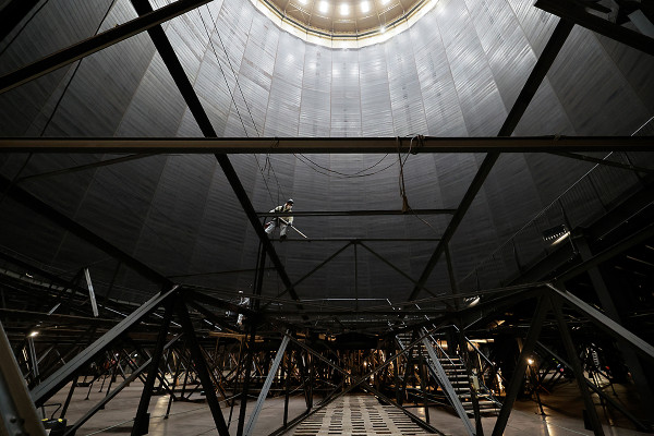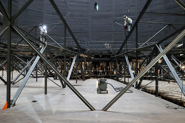 Im Inneren des Gasometers sah es bisher zappenduster aus. Die Dachgauben waren abgedeckt, und bis auf eine spärliche Notbeleuchtung gab es im Innenraum kaum Licht.