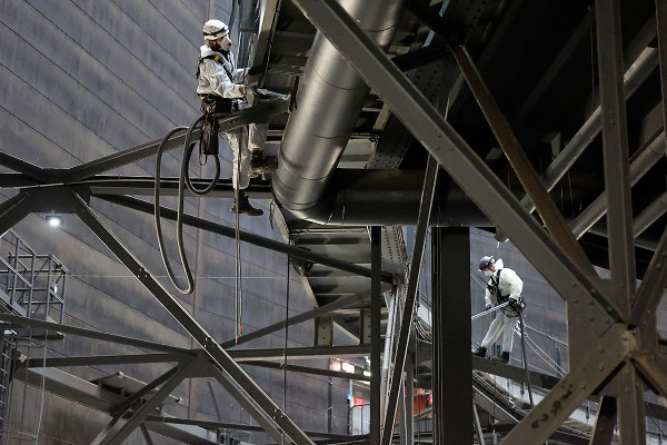 Der Frühjahrsputz im Gasometer fällt in diesem Jahr besonders gründlich aus. Gut gesichert sind die Reinigungskräfte dabei, jede Stahlstrebe im Inneren von Staub und Schmutz zu befreien. Und davon gibt es ja rund um die Manege so einige. Gut zwei Wochen wird die Reinigung aller Flächen im Gasometer dauern, danach beginnt der Aufbau der neuen Ausstellung „Das zerbrechliche Paradies“. *Baustellentagebuch im März 2021