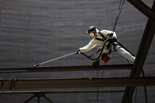 Die Korrosionsschutzarbeiten auf dem Dach stellten eine besondere Herausforderung dar, da die Tragkraft der Dachkonstruktion begrenzt war. Daher kamen ferngesteuerte Roboter zum Einsatz, die mittels Wasserstrahlverfahren die alten Farbschichten lösten. Danach wurde das Dach grundiert und mit einer grauen Deckschicht finalisiert. Auch die Unterseite des Daches, die Innendecke, musste komplett per Hand entrostet und beschichtet werden. Dies gelang allerdings nur mit einer besonderen, hängenden Gerüstkonstruktion, die direkt unter dem Dach des Gasometers, in knapp 110 Metern Höhe angebracht wurde. Es folgte das große Reinemachen im Inneren und der Abbau der Gerüstkonstruktion an der Fassade, was sich aufwändiger gestaltetet als geplant.