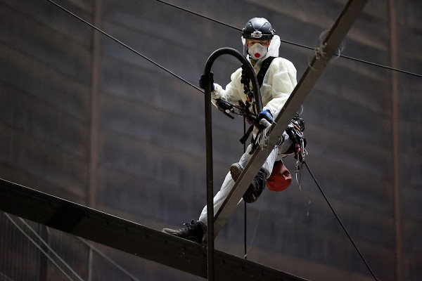 „Einhausungen (Singular: Einhausung oder Umhausung) sind“, laut dem allwissenden Wikipedia, „die völlige oder weitgehende Umbauung von störenden Emissionsquellen oder gegen Gefahren aus der Geländeumgebung.“ In Bezug auf die Gasometer-Baustelle soll die Einhausung zum einen dafür sorgen, dass die Strahl- und Lackierarbeiten vor Wettereinflüssen geschützt sind, und zum anderen die abgestrahlten Farbreste in dem entsprechenden Baustellenbereich verbleiben. Für die Arbeiten am Korrosionsschutz ist es entscheidend, dass die behandelten Flächen nicht nass werden, und dass bei der Trocknung der Farbschichten konstante Bedingungen in Bezug auf Luftfeuchtigkeit und Temperatur herrschen. Aus diesem Grund schließt die zur Einhausung eingesetzte Plane auch luftdicht ab. Zutritt zu diesem Bereich haben nur Facharbeiter mit entsprechender Schutzkleidung. Baustellentagebuch Mai 2020