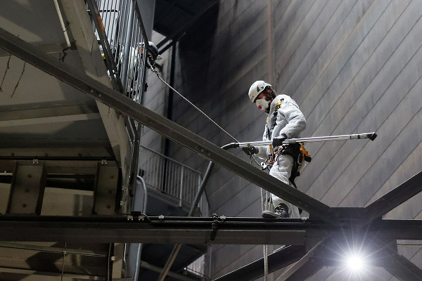 Bevor am Gasometer die Hüllen fallen, legen die Korrosionsschützer letzte Hand an. Die finalen Meter werden mit der neuen Deckfarbe beschichtet. Die neue Farbmischung – ein grauer Grundton mit einer oxydrötlichen Einfärbung – orientiert sich am Originalfarbton, der 1949 beim Wiederaufbau des Gasometers verwendet wurde. Der neuen Deckschicht wurde allerdings zusätzlich Eisenglimmer beigemischt, der den Korrosionsschutz verstärkt und zudem den Gasometer bei tiefstehender Sonne förmlich glänzen lässt. Baustellentagebuch im März 2021
