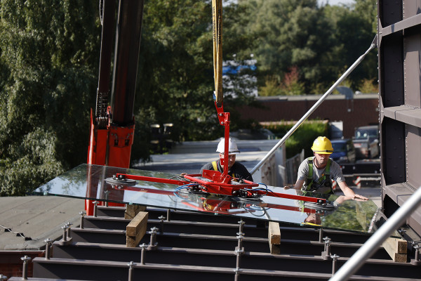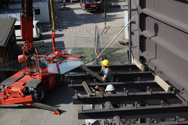 Der Gasometer putzt sich für die große Eröffnung am 1. Oktober heraus. In der vergangenen Woche erhielt der Eingangsbereich ein schickes neues Glasdach. Das darunter liegende Eingangsportal wird in den kommenden Tagen auch noch erneuert. Baustellentagebuch im September 2021
