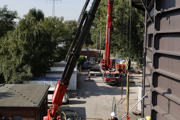 Bevor der Gasometer in Vorbereitung der Korrosionsschutzarbeiten eingerüstet werden kann, gilt es noch einige Teile an der Außenseite abzumontieren. Das ist auf bis zu 117,5 Metern Höhe schon eine Herausforderung. Ein großer Kran muss her, und damit dieser auch die notwendige Höhe erreicht, hilft ein kleiner Kran beim Zusammensetzen.