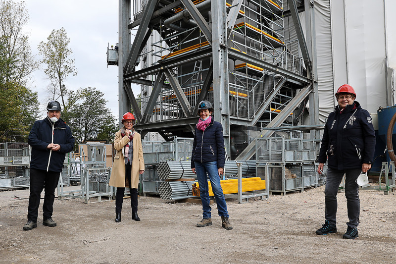 Personen von links nach rechts: Burak Dogan, Projektleiter Rodopi Marine GmbH; Daniel Schranz, (dunkler Helm) Oberbürgermeister der Stadt Oberhausen; Jeanette Schmitz, Geschäftsführerin der Gasometer GmbH; Karola Geiß-Netthöfel, Regionaldirektorin des Regionalverbands Ruhr; Ina Scharrenbach (ganz rechts) Ministerin für Heimat, Kommunales, Bau und Gleichstellung des Landes Nordrhein-Westfalen