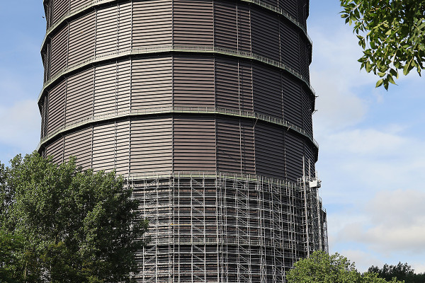 Zwar verstellt das rund 1.000 Tonnen schwere Fassadengerüst zuerst noch den ungetrübten Blick auf die Kathedrale der Industriekultur, doch auch dieses wird in den kommenden sechs Wochen abgebaut. Danach erhält der Gasometer sein ursprüngliches Aussehen zurück: Umläufe, Treppen und die charakteristischen Ausbläser werden mit Hilfe eines Spezialkrans und Industriekletterern montiert. Auch das braucht seine Zeit, vier Wochen sind dafür veranschlagt. Abschließend werden noch die Außenanlagen wiederhergestellt. Baustellentagebuch im April 2021