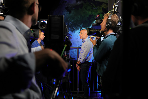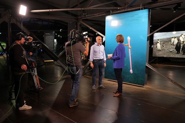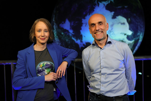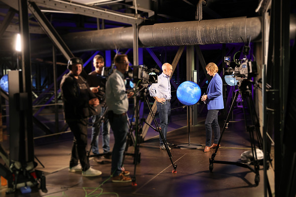 Das Wissenschaftsmagazin der ARD "Space Night science" drehte in der vergangenen Woche im Gasometer. Zu Gast bei Moderatorin Dr. Sibylle Anderl war Nils Sparwasser vom Deutschen Zentrum für Luft und Raumfahrt (DLR), der Fragen rund um das Thema Erdbeobachtung und Klimawandel beantwortete. Sparwasser zählt zum Kuratoren-Team der aktuellen Gasometer-Ausstellung "Das zerbrechliche Paradies" und gestaltete maßgeblich die Projektion der Erdskulptur.