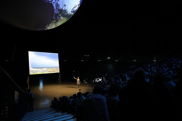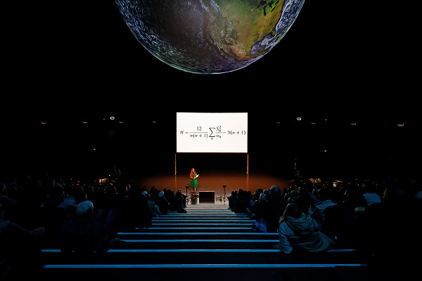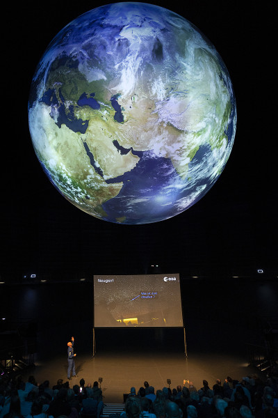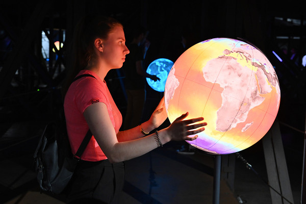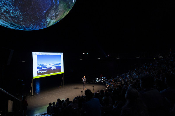 All diese Messwerte helfen, das komplexe Ökosystem unserer Erde zu verstehen – wissenschaftlich, aber auch emotional: Vereint in einer animierten Projektion entsteht auf der 20 Meter großen Erdkugel ein Gesamtkunstwerk voll bildgewaltiger Anmut. Unterlegt ist dieses visuelle Erlebnis mit speziell für die Ausstellung verfasster Musik des Österreichischen Komponisten Rupert Huber.