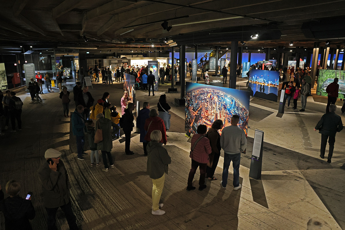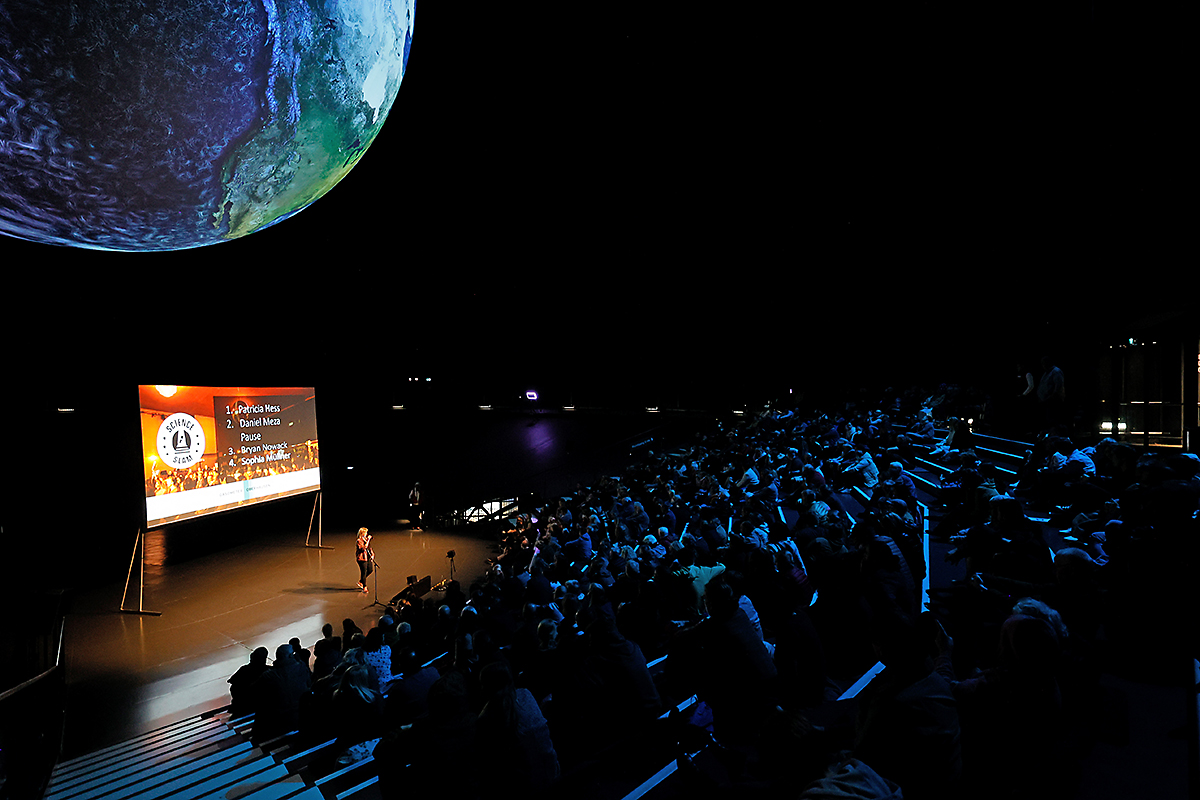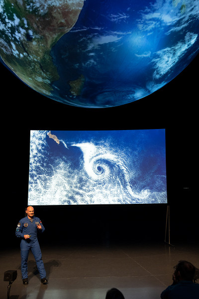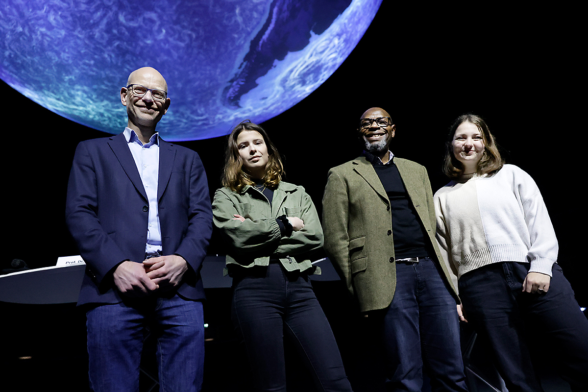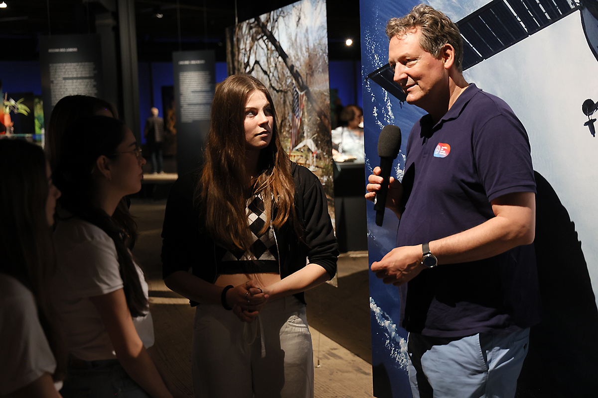 An die Präsentationen der Schülerinnen und Schüler schlossen sich weitere Highlights an. Zunächst berichtete der deutsche ESA-Astronaut Dr. Gerhard Thiele von seinen Erlebnissen im Weltall. Er umkreiste im Jahr 2000 an Bord eines Space Shuttle viele Male die Erde. Seine Mission diente dazu, die Landmassen mithilfe von Radarsensoren topografisch zu vermessen und so ein 3D-Höhenprofil der Erdoberfläche zu erstellen. Das leitete nahtlos zu den Ausführungen von Nils Sparwasser über: Der DLR-Experte für die satellitengestützte Fernerkundung erläuterte, wie wichtig die Daten aus der Umlaufbahn sind, um den „Gesundheitszustand“ unseres Planeten zu untersuchen – unverzichtbare Informationen für die Klima- und Umweltforschung. Er war auch wesentlich an der Erstellung der animierten Erdkugel beteiligt, die beim jugendlichen Publikum am Ende der Veranstaltungen für Staunen sorgte: Auf dem übergroßen Globus bewegten sich Wolken, wechselten Tag und Nacht ab, zogen Schiffe und Flugzeuge ihre Spuren rund um die Welt. Diese knapp 20-minütige Vorführung ist Teil der Ausstellung „Das zerbrechliche Paradies“, die auch von den anwesenden Schulklassen besichtigt werden konnte. Sie ist noch bis zum 26. November 2023 von Dienstag bis Sonntag und in den Schulferien sogar täglich von 10:00 bis 18:00 Uhr