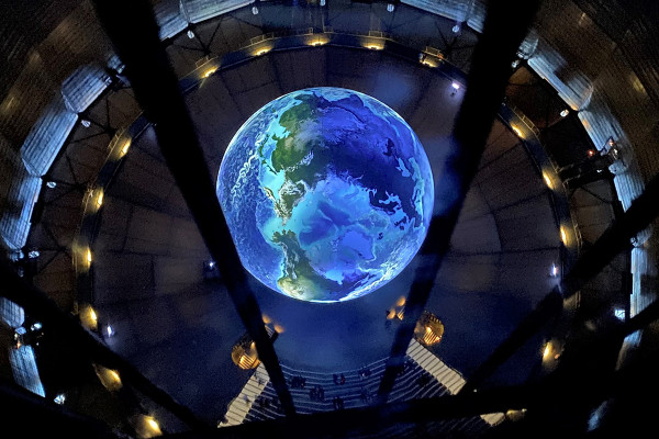 Vom All aus auf den eigenen Planeten schauen. Ein Gefühl das nur Astronaut*innen kennen. Nicht ganz: Denn auch unter der im Raum schwebenden Erdkugel im Oberhausener Gasometer ist dieser beeindruckende Blick möglich.
