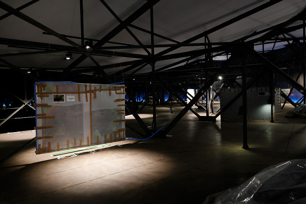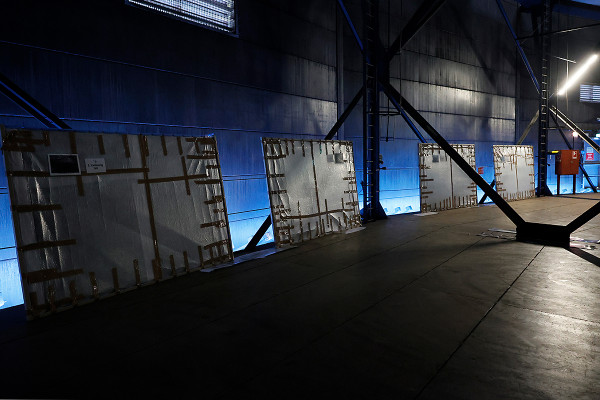 Im Inneren des Gasometers verläuft der Aufbau der Ausstellung nach Plan. Die Ausstellungsbilder hängen bereits an ihren Plätzen. Vorerst bleiben die Exponate allerdings in ihren schützenden Verpackungen. Ausstellungsaufbau im Juni 2021.