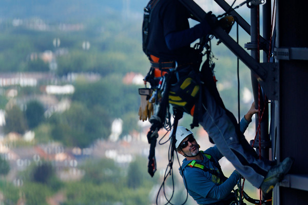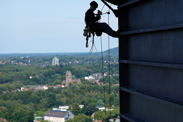 Da diese Riesenplakate natürlich nicht einfach an die Fassade geklebt werden können, kommen hier versierte Profis zum Einsatz. In luftiger Höhe seilen sich Industriekletterer Peter Peilert und sein Team vom Gasometer ab, bringen die insgesamt 24 Einzelteile in Position und verbinden sie zu zwei überdimensionalen Megapostern. Die bis zu sieben Kletterer vom „Höhenhandwerk“ wissen was sie tun, denn bereits bei den Gasometer Ausstellungen „Der Berg ruft“, „Christo: Big Air Package“, „Der schöne Schein“ und „Wunder der Natur“ kam ihre Expertise zum Einsatz. Bleibt uns nur noch die traditionelle Grußformel von Bergsteigern – und auch Fassadenkletterern – zu rufen: „Berg Heil!“