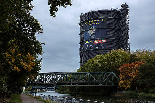 Megaposter zur neuen Ausstellung „Das zerbrechliche Paradies“ an der Fassade des Oberhausener Gasometer angebracht