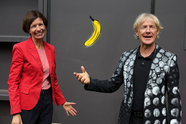 Am Dienstag kam der berühmte Künstler nun nach Oberhausen, um eine strahlend neue Banane an die Eingangstür zu sprayen. Fröhlich fruchtig hat diese ihren Platz eingenommen und erfreut ab sofort wieder die Besucher/innen der aktuellen Schau „Das zerbrechliche Paradies“ - wie natürlich auch aller kommenden Ausstellungen. Und auch Thomas Baumgärtel, der bei dem Termin tiefe Einblicke in seinen Werdegang gab, freute sich: „Die Banane zeichnet besondere Kulturorte aus, sie ist sozusagen mein persönliches Gütesiegel. Außerdem passt Street Art hervorragend zu Orten der Industriekultur wie dem Gasometer.“
