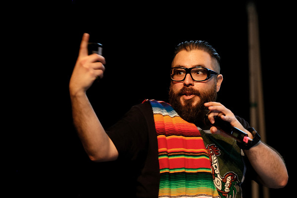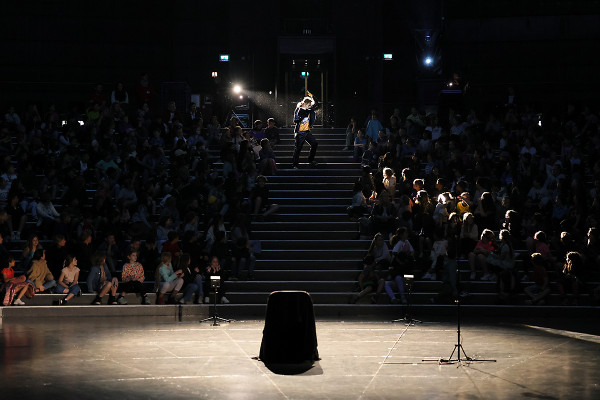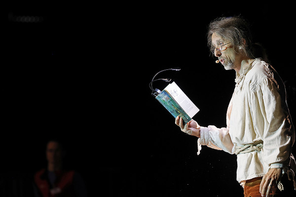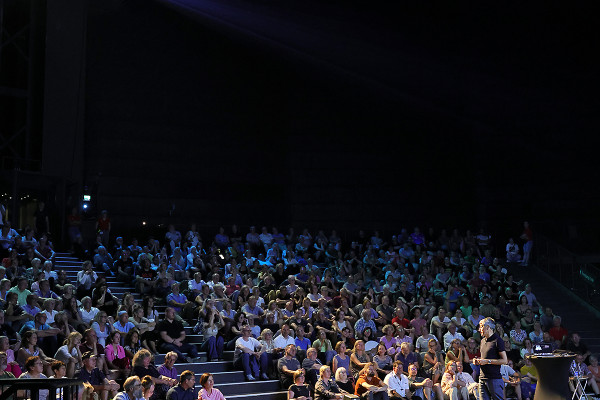 Im Innenraum - direkt unter der schwebenden Erdkugel - trug der bekannte Schauspieler Rainer Rudloff skurrile Geschichten aus “QualityLand“ von Marc-Uwe Klings oder dem Reisebuch “Die Letzten ihrer Art“ von Douglas Adams vor. Früher ist der Kultautor "Per Anhalter durch die Galaxis" gefahren, im Gasometer lauschten die Besucher*innen nun Ausschnitten seiner Reise rund um den Globus. Spielerisch, humorvoll und fesselnd erzählte Rudloff dabei auch vom entspannten Plausch mit einem Berggorilla.