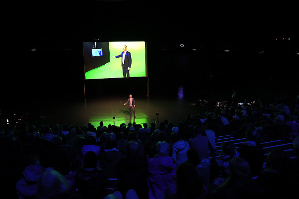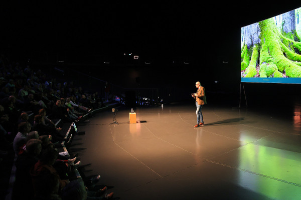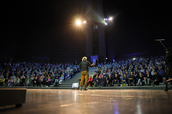 Die Bühne war gerichtet, das Publikum freute sich auf den Vortrag, Buchautor Peter Wohlleben stand im Scheinwerferlicht - plötzlich: Dunkelheit. Licht weg, Ton weg, Bild weg und sogar die im freien Raum schwebende Erdkugel strahlte nicht mehr. Stromausfall in Teilen von Oberhausen! Der guten Stimmung tat dies keinen Abbruch, nach einiger Zeit war die Versorgung mit Energie wieder hergestellt und unter jubelndem Applaus setzte Wohlleben seine spannenden Erzählungen fort.