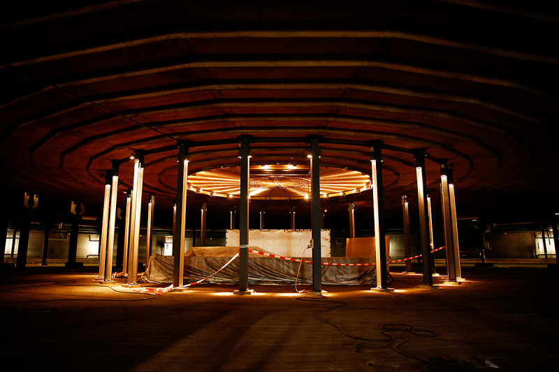 Im Inneren des Gasometers sah es bisher zappenduster aus. Die Dachgauben waren abgedeckt, und bis auf eine spärliche Notbeleuchtung gab es im Innenraum kaum Licht.