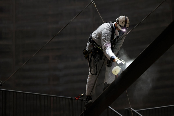 An der Rotunde auf dem Dach des Gasometers sind Schweißarbeiten notwendig geworden.